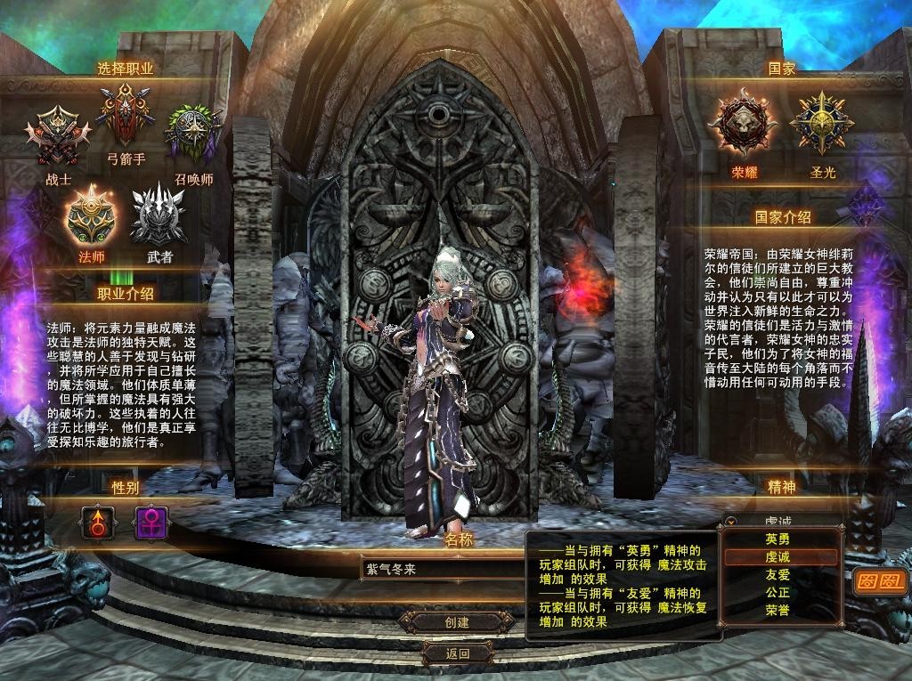 职业阵营什么的都是一样一样一样的,比较有新意的就是那个精神系统,就是让你组队练级团PK的时候,效率更高一些。像我法师就选个虔诚嘛,和英勇组队加法伤,和友爱组队+回魔。