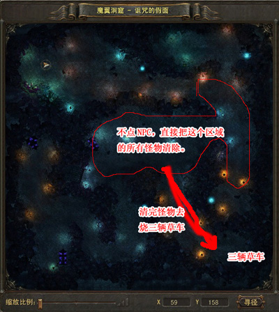 4、然后NPC“赛杰尔”出现在下图位置,直接无视他,先去清除地图所标识的区域的所有怪物。并利用拣到的任务物品“打火石”,去烧三辆草车。