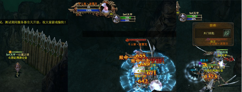 8、击杀完1号BOSS后,跑到2号木门等NPC进来开门,一开门就会2号BOSS,千刀和二只精英怪,在打BOSS时NPC也会加入攻击怪物。打到一半时后再刷3号BOSS,和2号的名字差不多,一定要拖住NPC和你一起打BOSS,不能让NPC一个人往前走,因为怪打NPC,NPC会掉血!打完BOSS拿到1号木门的钥匙。