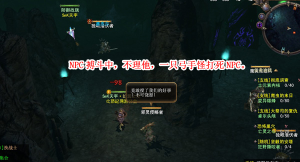 10、由于之前那只弓手怪是杀不死NPC的,所以要预留二只怪给NPC杀。刚好岔口的二只怪我们引不到,就留给NPC吧,这二只足以磨死NPC,哈哈。
