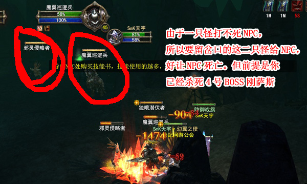9、杀完2、3号BOSS和精英怪后,NPC往前走,遇到弓手怪,这时你可以不用去这只怪,速度去杀4号最终BOSS刚萨斯。你要在NPC给小怪杀死前把4号最终BOSS刚萨斯杀完并领完奖励。