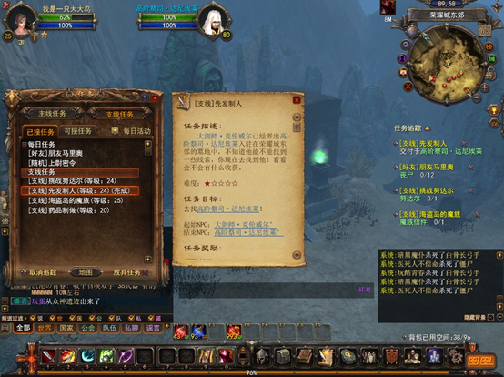 25级在主城把主要新内容体验完以后,就可以开始打怪升级了,主线任务发展到了荣耀城东郊。在荣耀城领取了“先发制人”的任务,在荣耀成东郊找到了NPC高阶祭司达尼埃莱。完成任务后领取了一个新的任务。要求杀死60个白骨长弓手!这也太多了吧?!