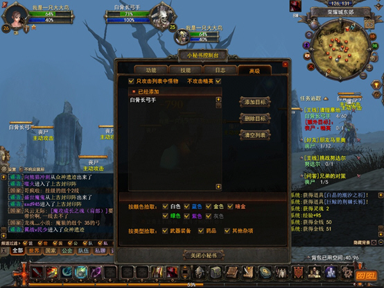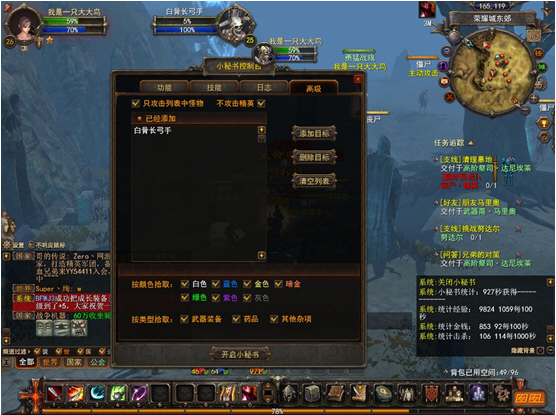 设置完技能后玩家针对专门的需求,可以选定需要打的怪物,比如现在这个任务,我把刷怪目标集中在白骨长弓手上。除此以外还可以设置拾取物品,拾取装备的颜色。
