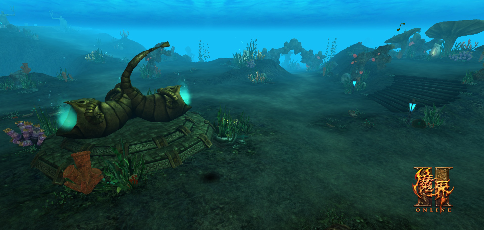 蓝色的海浪在头顶不断的咆哮,然而海面下的世界却是异常平静。随处可见的奇异植物,宛如号角的鱼嘴处泛着淡绿色的光芒。这便是这块神魔大陆上最神秘的风景——海底世界。