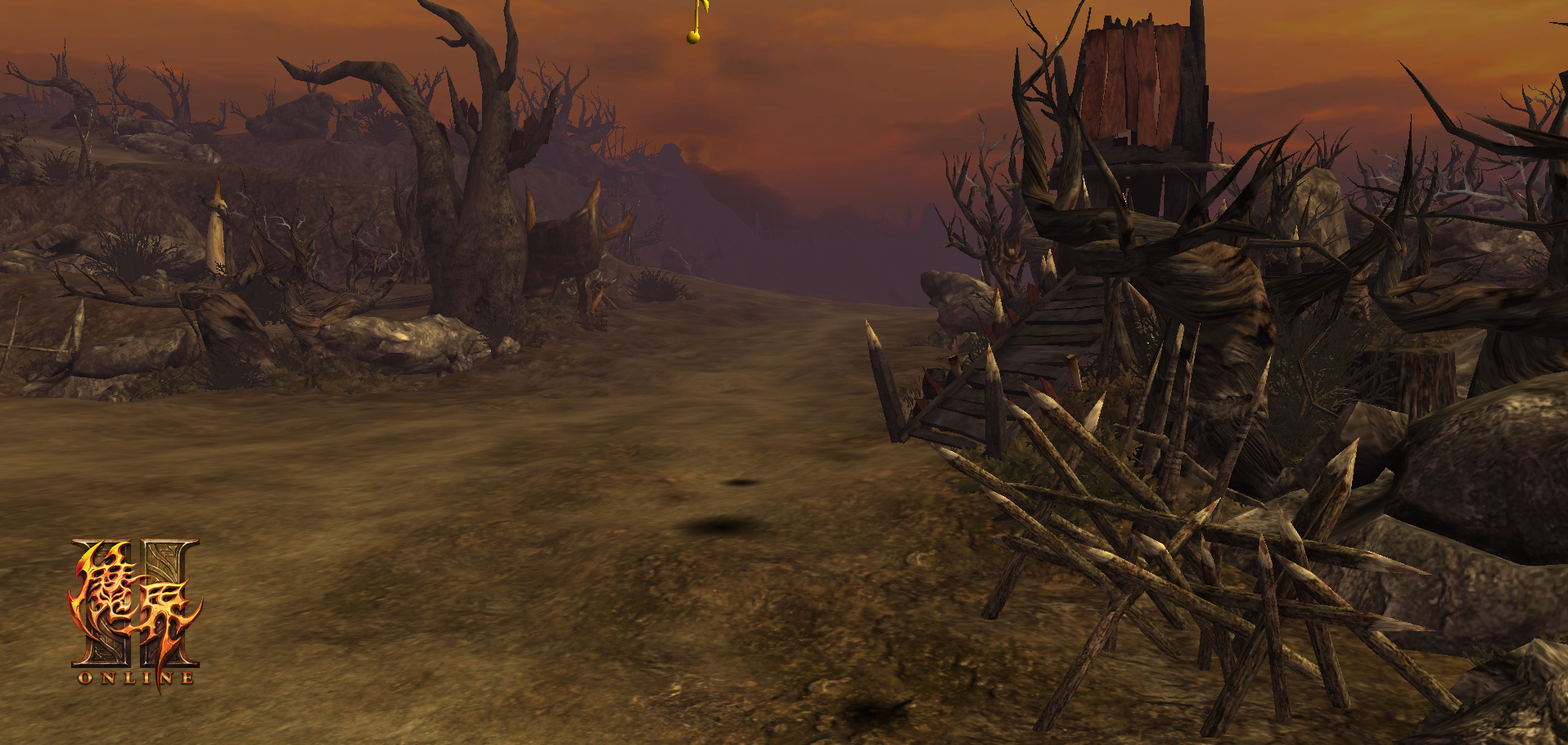 曾经绿色盎然的森林在战争的侵扰下已不复存在,剩下的只有枯黄的树枝和随处可见战场上用来防御的栅栏。破损的战旗随风摇摆,昏暗的天空与渐起黄沙的平地构成了这块神魔大路上最萧瑟的风景——卡伦森林。
