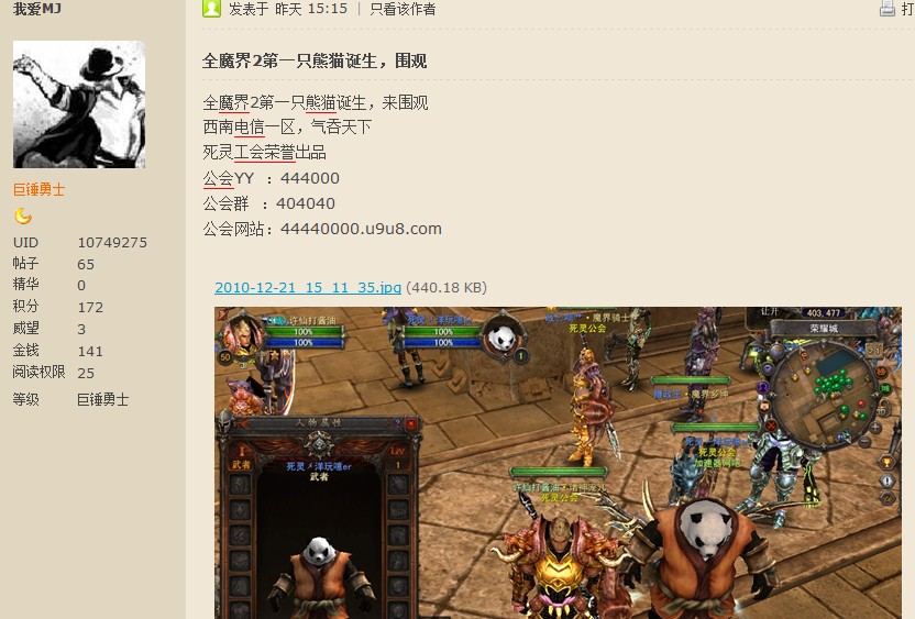 而当论坛出现这样的帖子后,魔界2市场工作人员通过该帖子留下的公会YY号直接“闯”进了公会群里“求聊天”。 而通过“死灵公会”的介绍,正在游戏中的这位第一熊猫人终于现身和工作人员聊天。