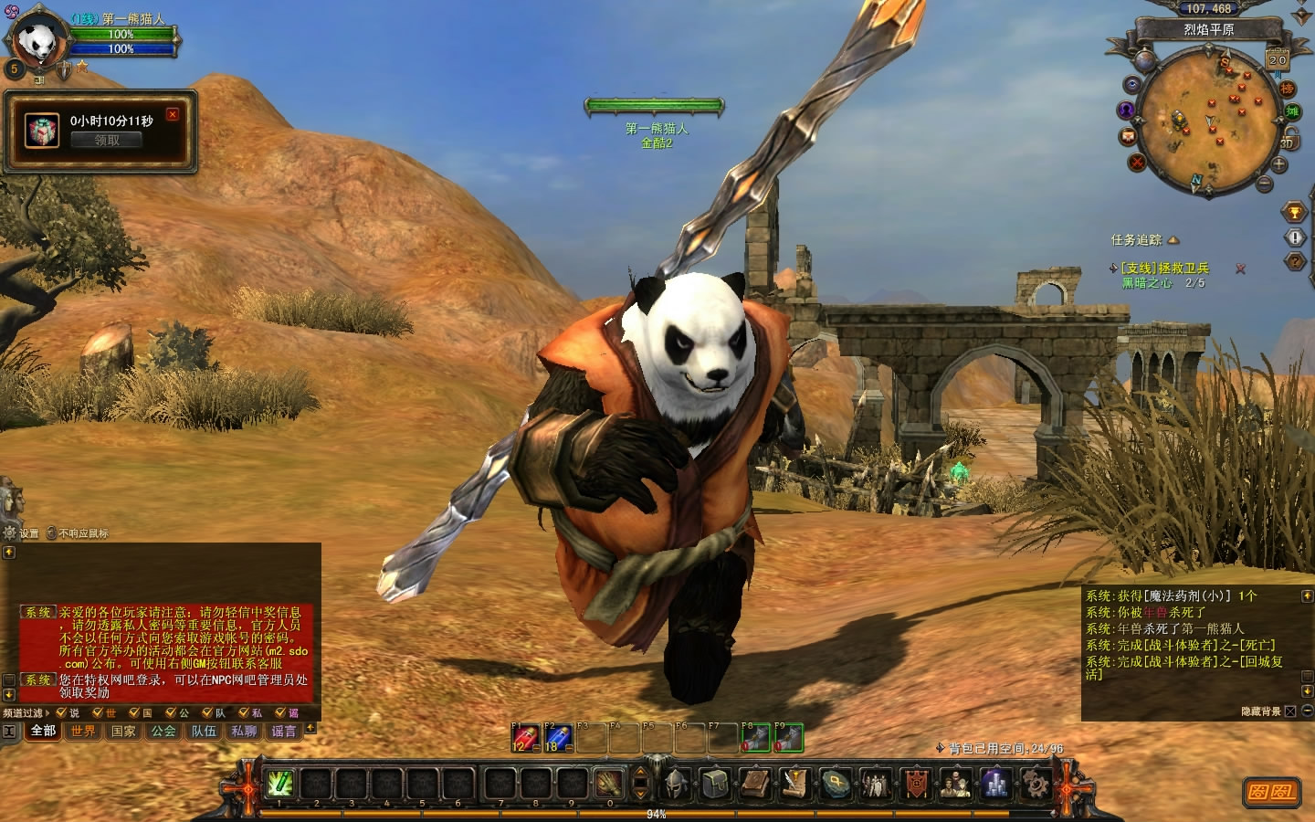 在《魔界2》中熊猫人作为英雄职业“狠”熊猫,给玩家展示不为人知的另一面,施展起中国功夫,当然“狠”给力。无论是武者熊猫人2个职业分支的哪一个分支,都是当仁不让的“狠”职业。无论是单条BOSS还是团队副本都会给人留下深刻的印象,尤其是在《魔界2》的3D千人国战中更是将武者的优势发挥得淋漓尽致。在网游流行战争的年代,武力至上的熊猫人,怎能不让你心动?